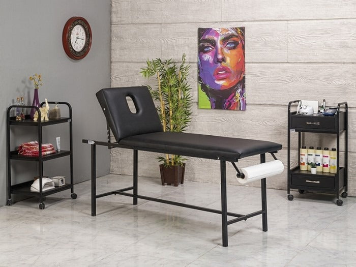 1 tanesi çekmeceli 3 adet metal çerçeve üzerine ahşap rafı bulunmaktadır.