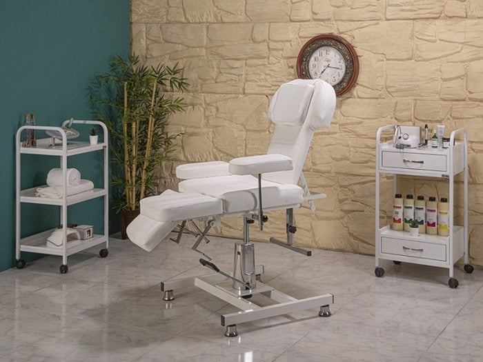 1 tanesi çekmeceli 3 adet metal çerçeve üzerine ahşap rafı bulunmaktadır.